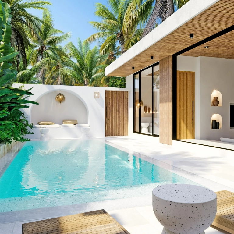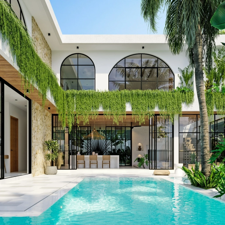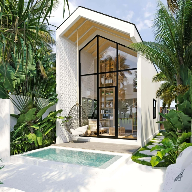Sapta Cemagi is designed to ensure each villa is a private oasis, with open-plan living areas, a turquise pool, and lush gardens. The communal areas have tropical landscaping to welcome guests into their holiday homes.