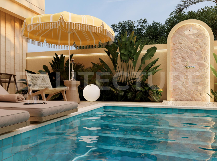 Every villa is thoughtfully designed for solo travelers, couples, or small families, featuring a private pool, landscaped courtyard, and fully furnished interiors. The 69 m² villa offers a flexible layout called “Comfort for Two + Family Option”, complete with a cozy living area, kitchen, two bathrooms, and a terrace with pool access—perfect for both romantic getaways and family stays.
