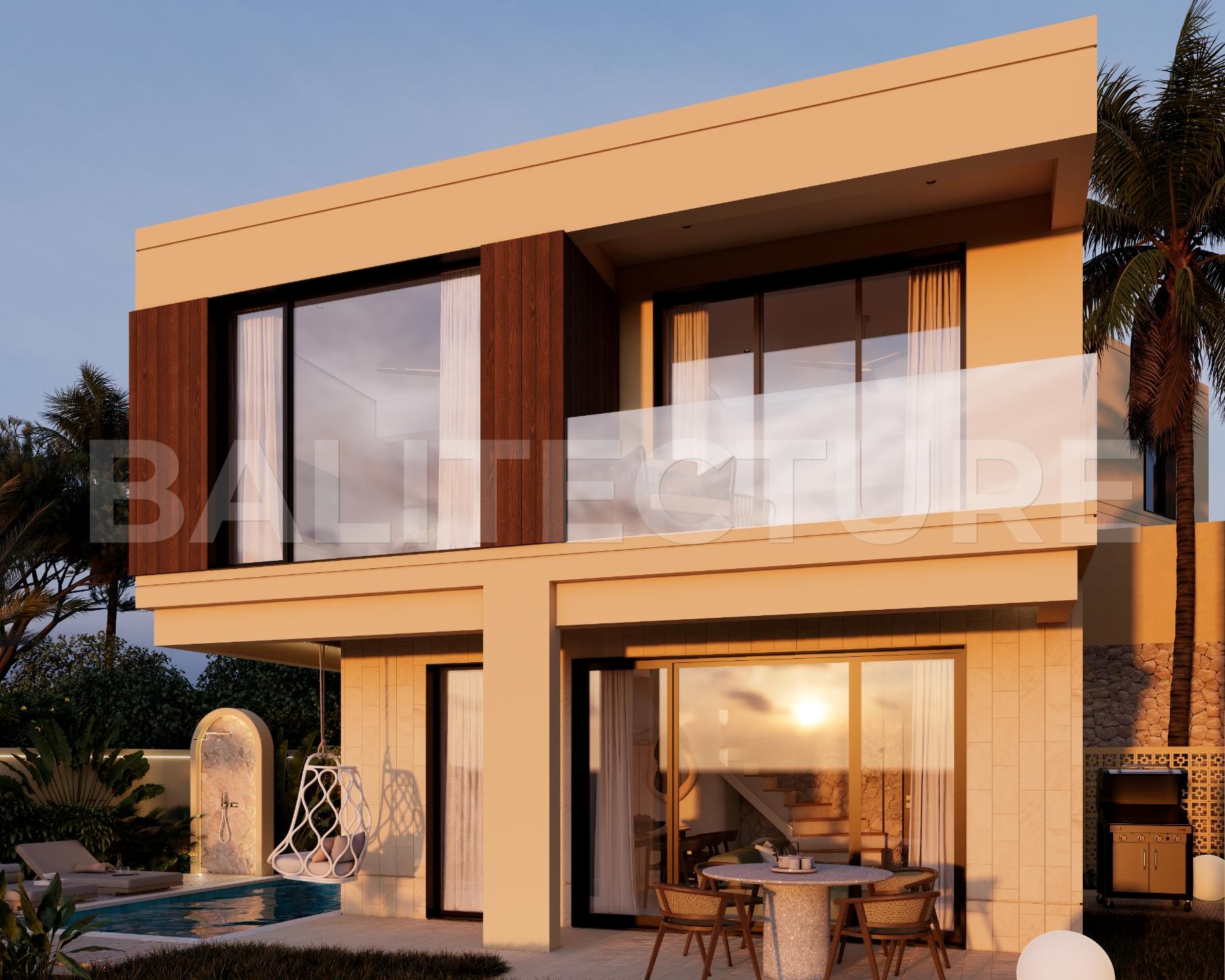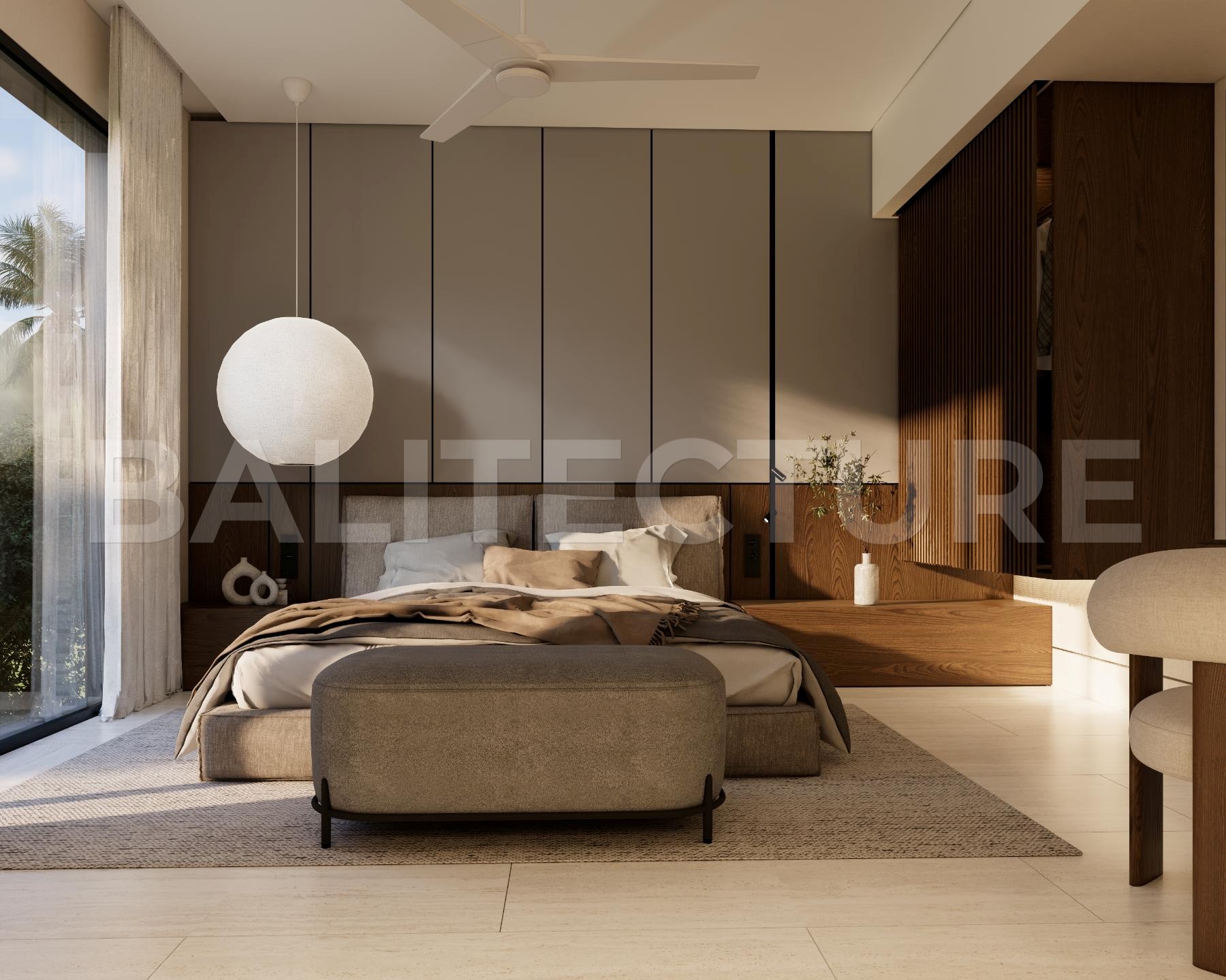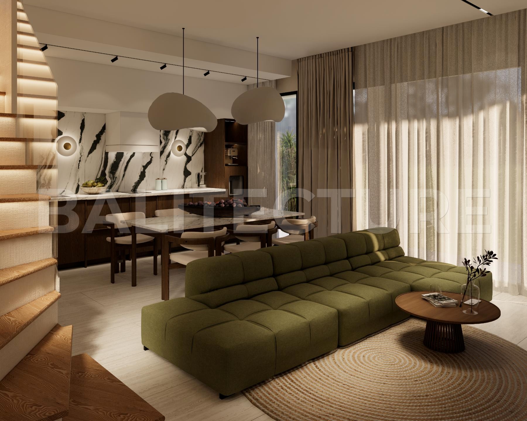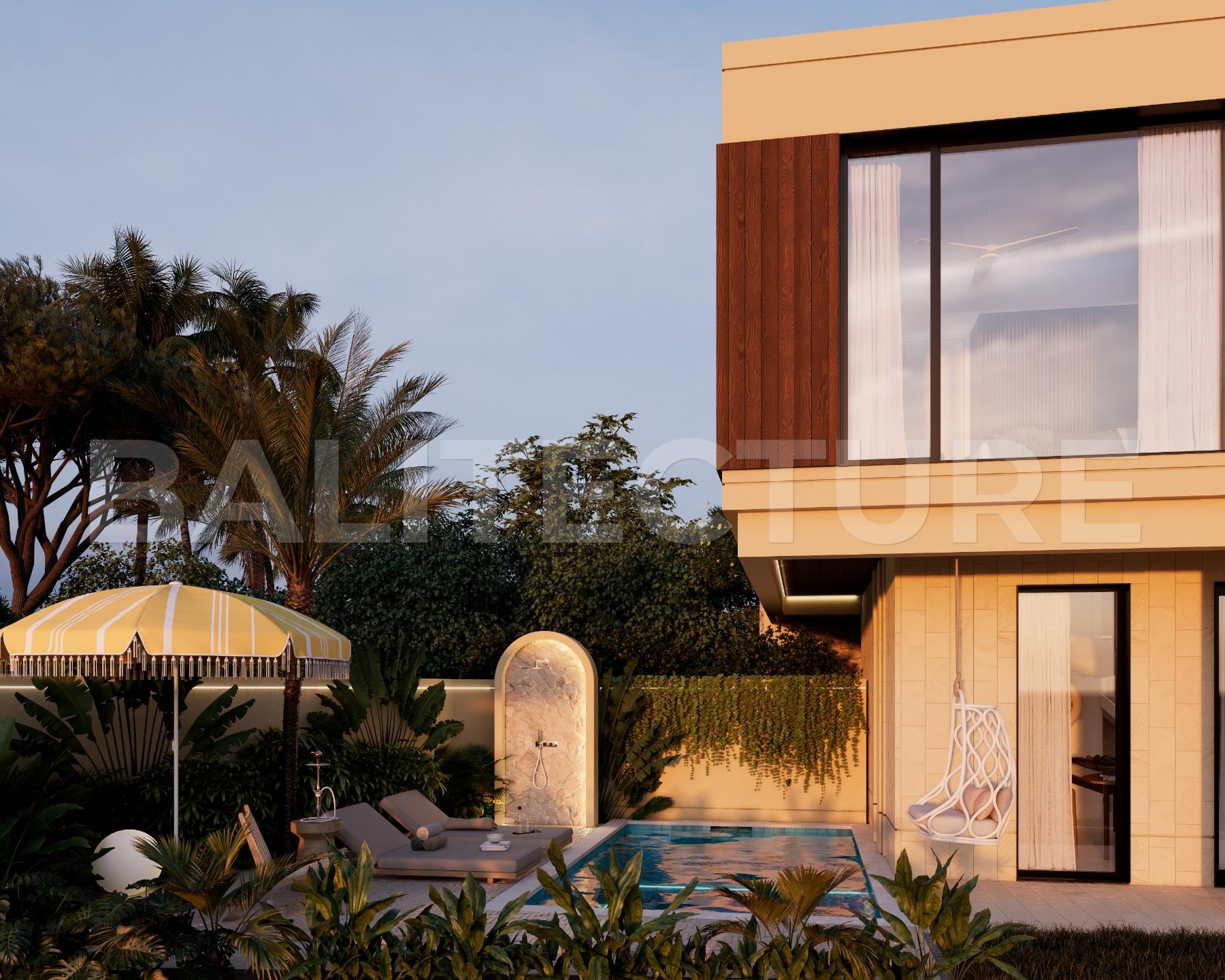 The development showcases a Japandi × Boho Tropic architectural style, enhanced by local Balinese artists who crafted murals, sculptures, and bas-reliefs that turn the complex into a “living art gallery.” A unique bathhouse and wellness hub—complete with saunas, hammam, massage rooms, rooftop lounge, yoga zones, and restaurant—forms the social heart of the community, combining wellness, art, and leisure in one inspiring environment.