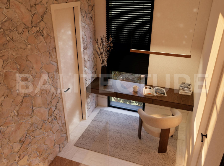 The 91 m² villa typology offers maximum space and privacy, ideal for families or groups. The ground floor features an open-plan living room with kitchen, dining, and lounge area, a guest bathroom, and direct access to a private courtyard with an infinity-edge pool. Upstairs, two bedrooms come with workspaces, wardrobes, and a shared bathroom with a bathtub. The courtyard adds an outdoor kitchen, fire lounge, and art garden, making it perfect for relaxation or small gatherings.