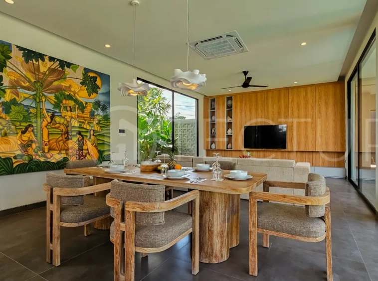 Located in the peaceful area of Mas, Ubud, this brand new 3-bedroom tropical minimalist villa offers a perfect blend of style and comfort. Set on 414m² of land with 252m² of living space, the property features a lush garden, sunken lounge pit, and private swimming pool. Each bedroom comes with its own ensuite bathroom, while the spacious enclosed living room is highlighted by elegant wooden wall panels and a fully equipped kitchen.