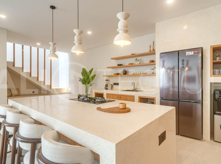 Designed with a contemporary tropical concept, the villa features a bright and airy layout with an open plan living room, dining area, and kitchen, creating a seamless flow for everyday living and entertaining. Large openings and smart space planning allow natural light and ventilation to fill the home, giving it a calm and inviting atmosphere.