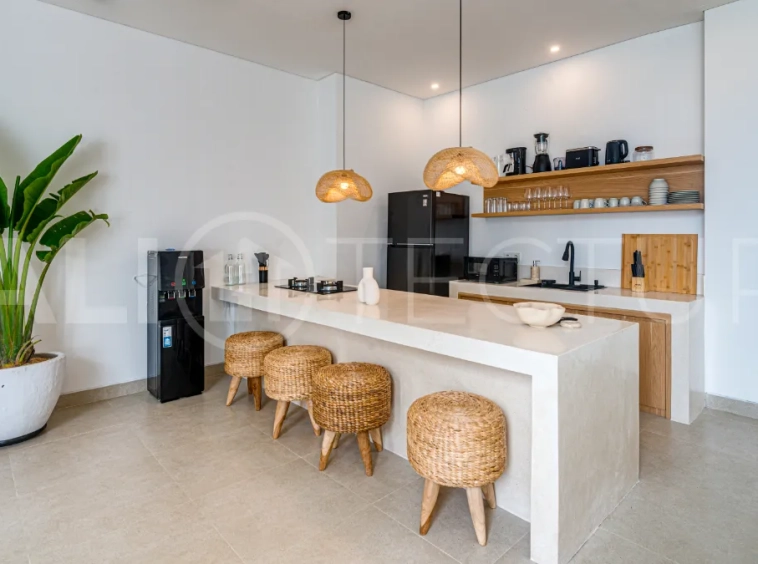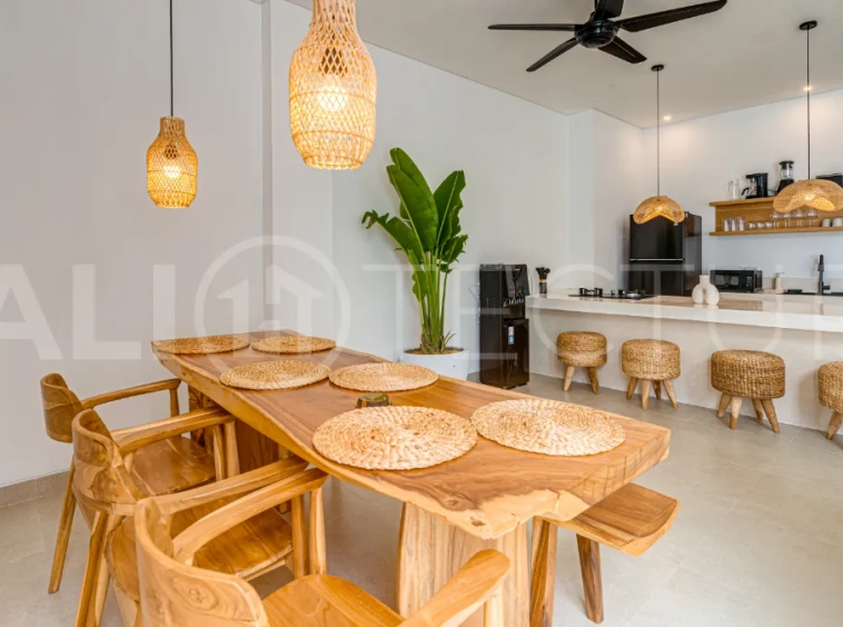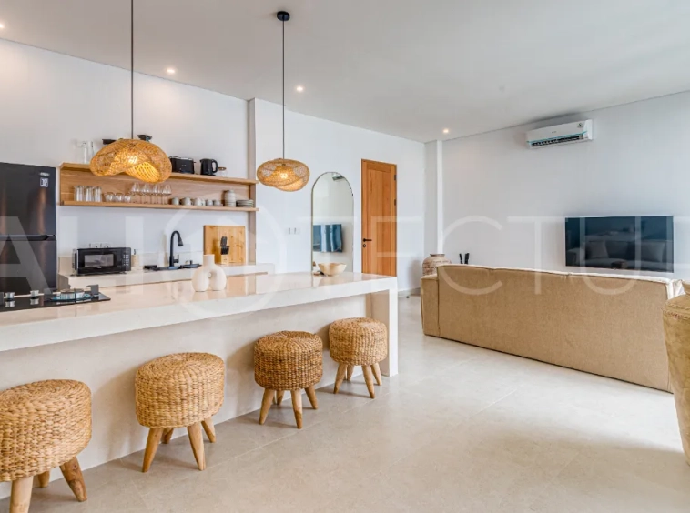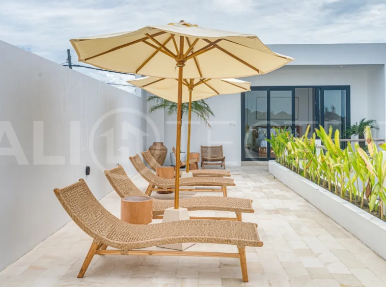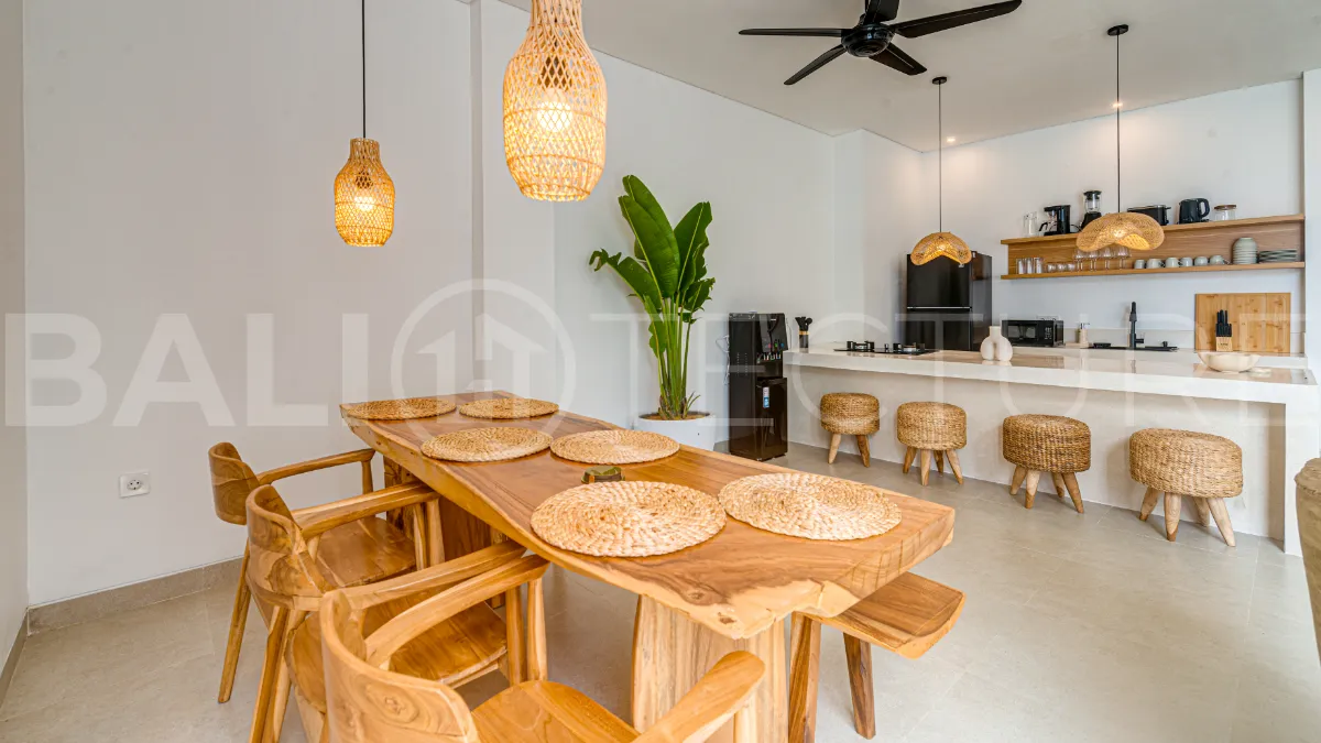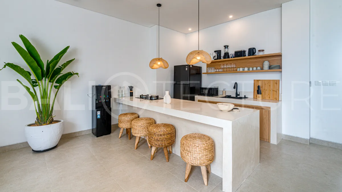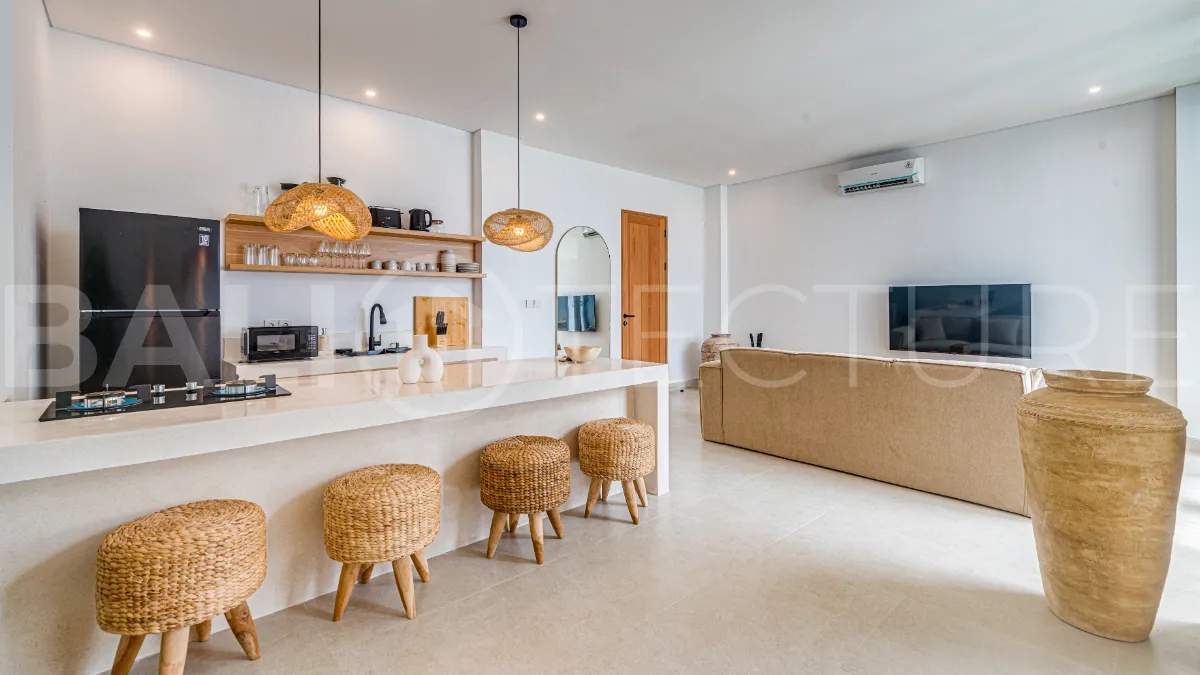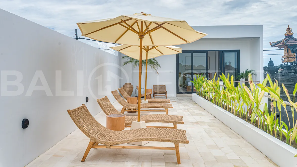 The fully equipped kitchen includes an island, fridge, microwave, cooking appliances, utensils, and complimentary drinking water, perfect for preparing home cooked meals. The inviting living area offers a spacious dining space, comfortable sofa, and smart TV for relaxed evenings. A rooftop terrace with sun loungers, umbrellas, and panoramic views creates the perfect setting for sunset cocktails. This villa presents a compelling opportunity to acquire a quality property in one of Bali’s increasingly desirable coastal locations.