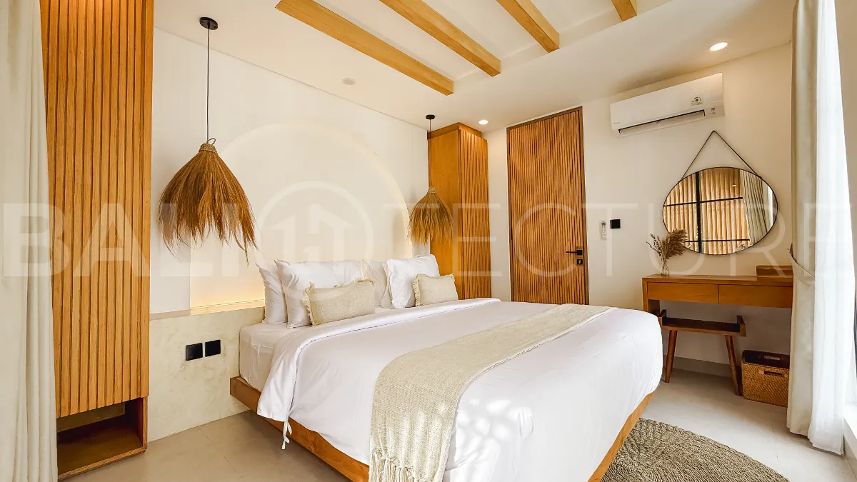 Located within the exclusive Casa Cemagi complex, this 3 bedroom villa showcases a refined blend of tropical modern architecture and Mediterranean elegance, thoughtfully designed by Balitecture. The bedrooms feature clean lines, arched headboards, and natural wood accents, creating a calm yet sophisticated ambiance. The minimalist bathrooms are styled in warm, earthy tones and highlighted by a distinctive white stone bathtub, offering a spa inspired experience.
