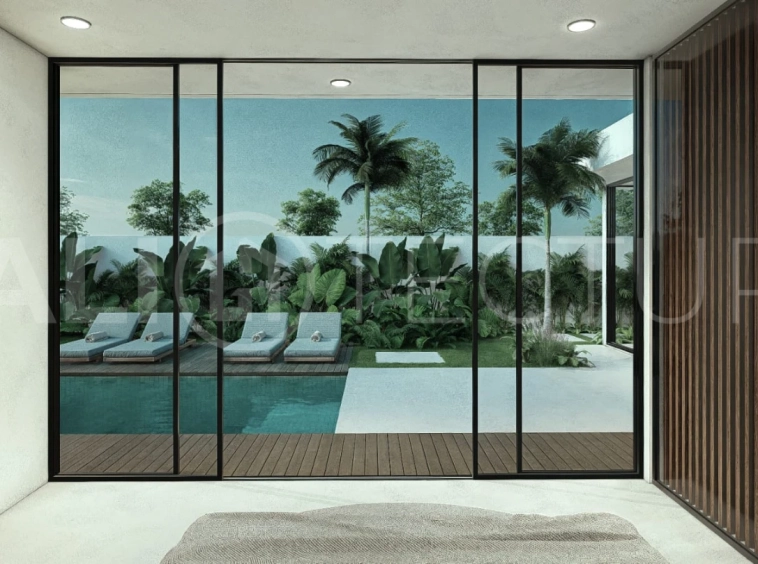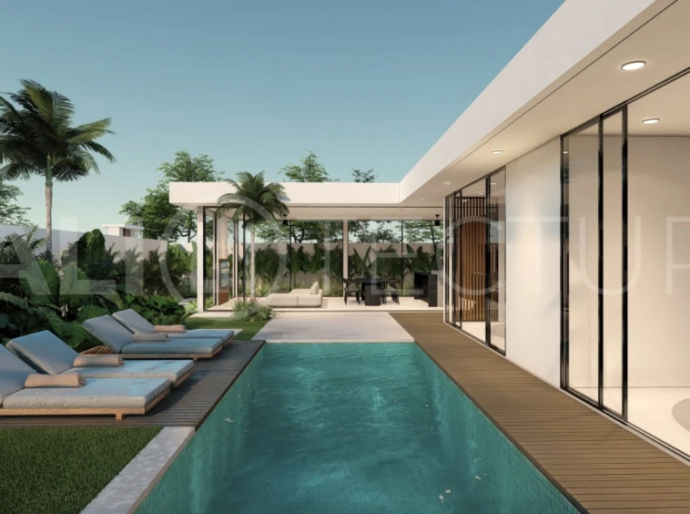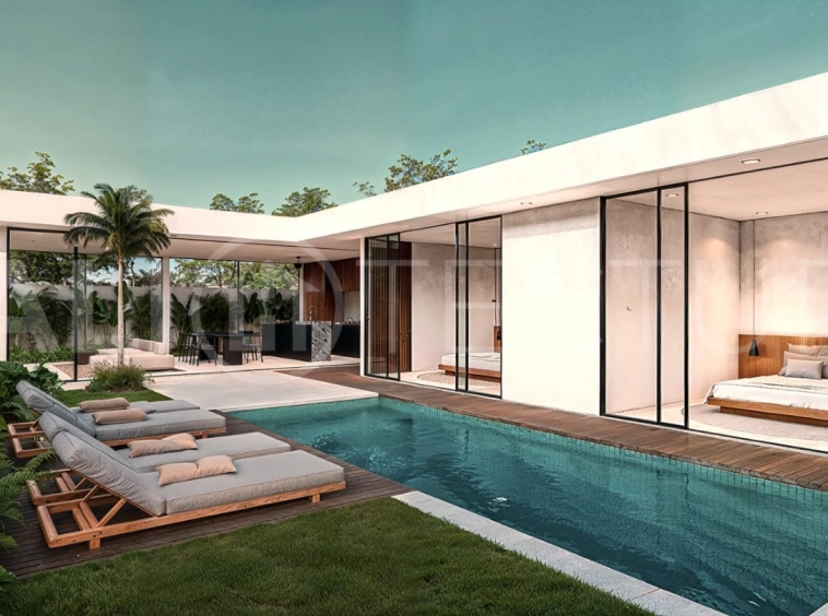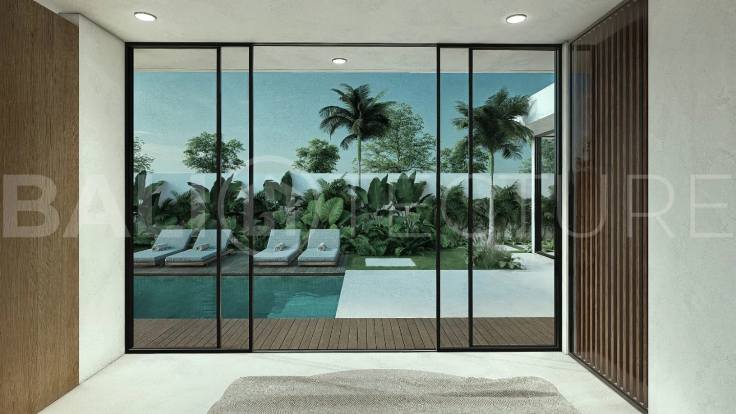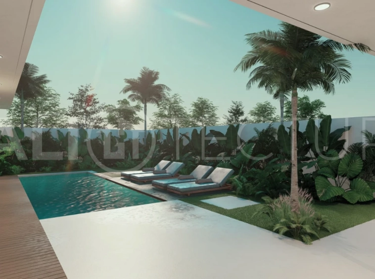 This off plan modern 2 bedroom villa is perfectly located in a quiet residential area between Seminyak and Kerobokan, offering both privacy and convenience. Built on a 250m² land plot with a 90m² building size, it combines a stylish modern layout with comfort. The villa features an 18.5m² swimming pool with a wooden deck terrace, surrounded by a lush tropical garden. Inside, there is an enclosed living room and a kitchen with dining area, while both bedrooms with ensuite bathrooms are thoughtfully separated from the living space for privacy. Offered on a 30 year leasehold, only 1 unit remains available out of 2, with completion expected in May 2026.