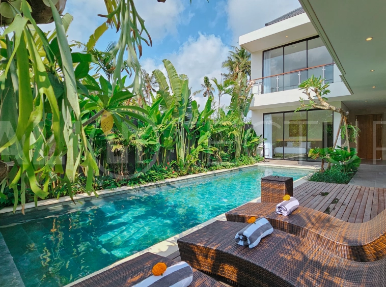 This stunning 2 story tropical minimalist villa is set on 310m² of land with 250m² of thoughtfully designed living space. Surrounded by a lush garden and offering serene rice field views, the villa features 3 spacious bedrooms with ensuite bathrooms, a private 36m² swimming pool, and an enclosed living area with elegant wooden wall panels. A fully fitted kitchen completes the home’s warm and modern feel.