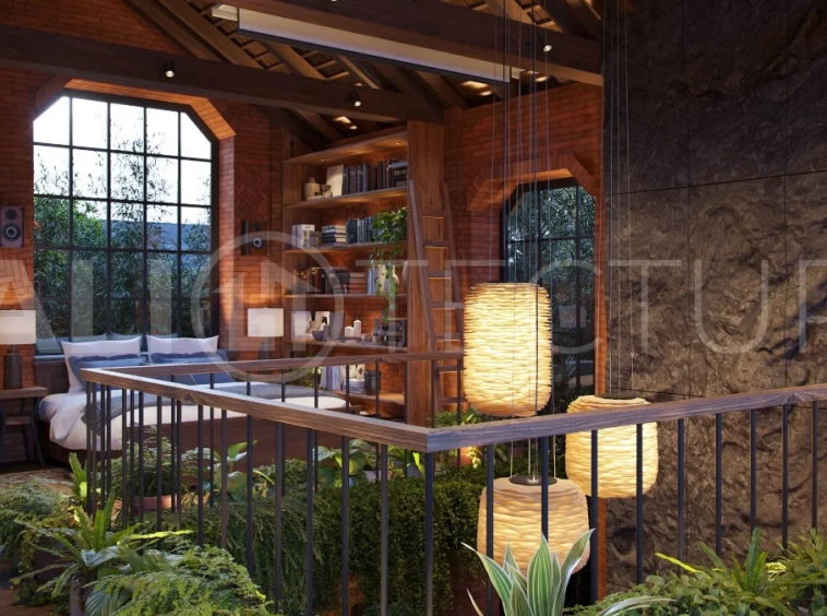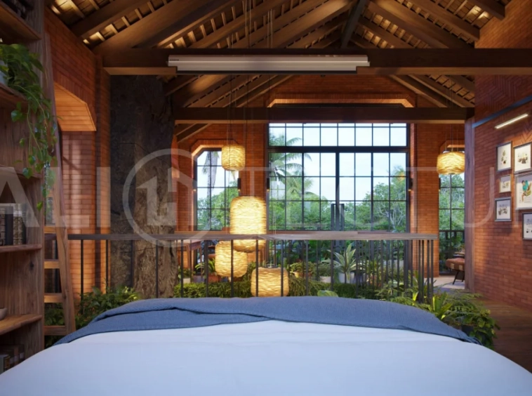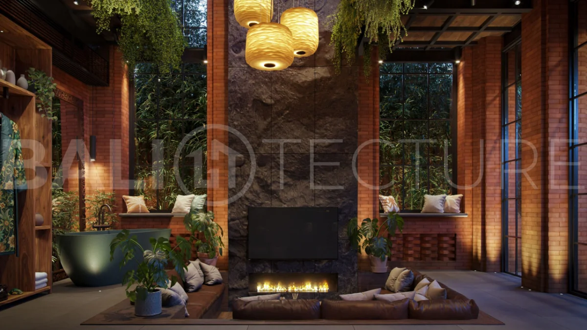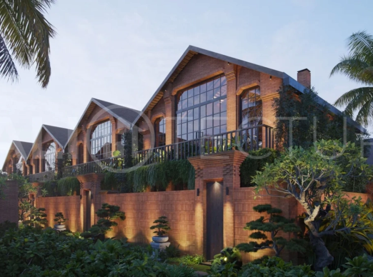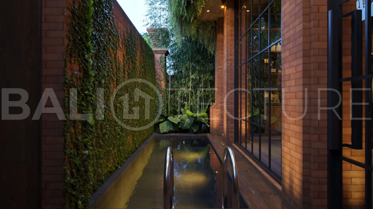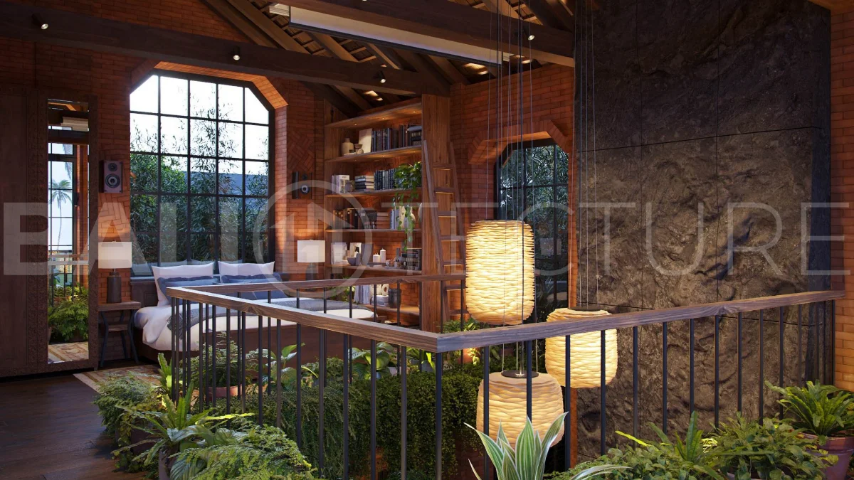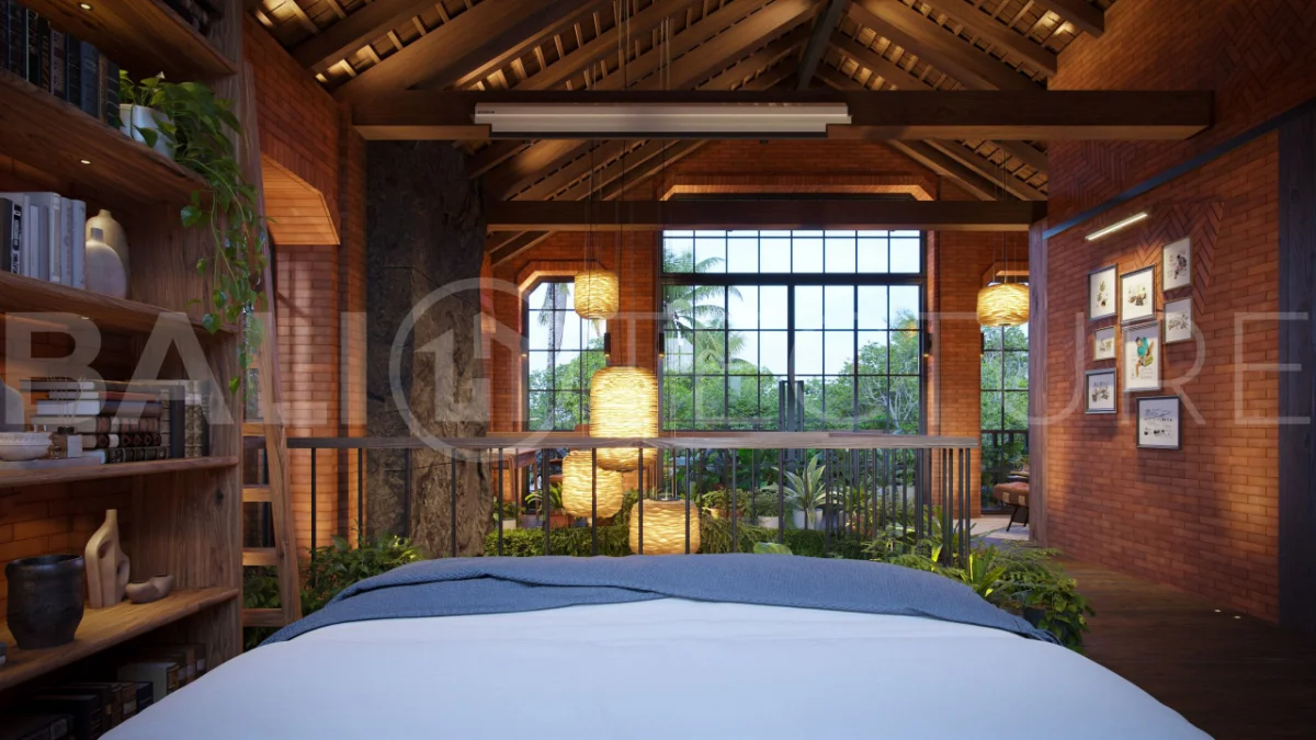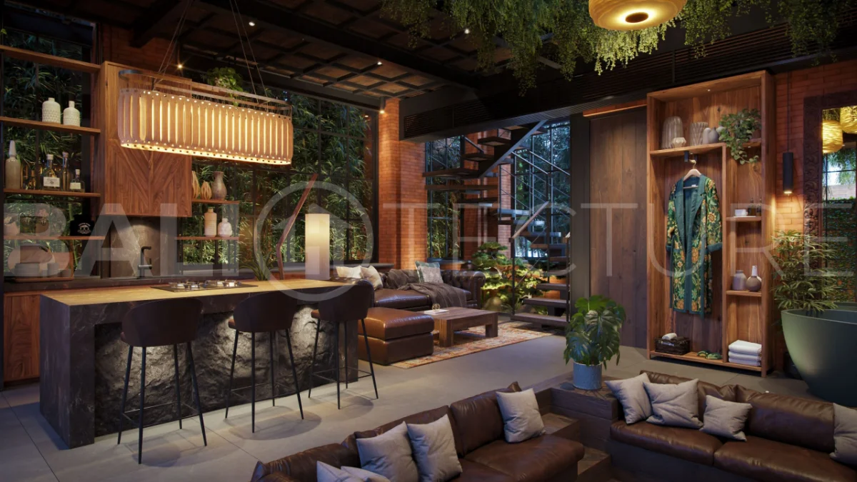 The architectural concept presents a refined fusion of industrial loft aesthetics with the timeless elegance of traditional Balinese design. Elements such as handcrafted brickwork, sculptural details, and lush tropical landscaping create a unique and atmospheric living environment that reflects both character and cultural depth.