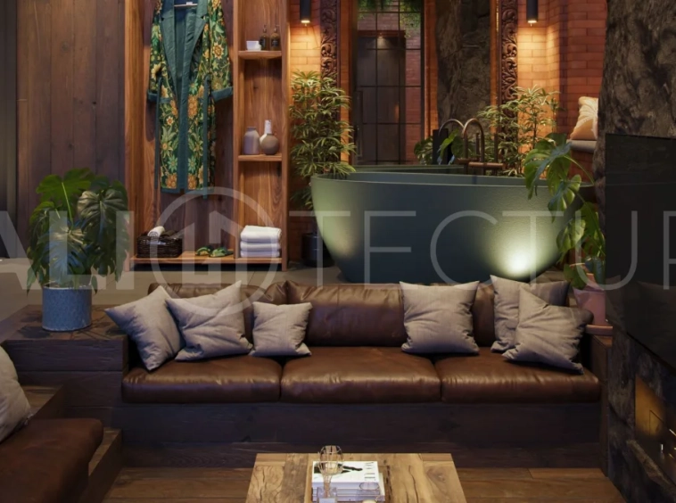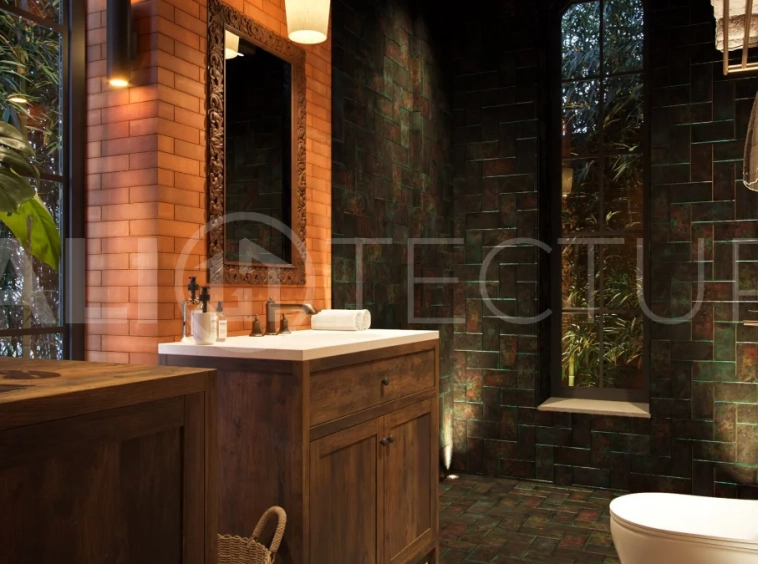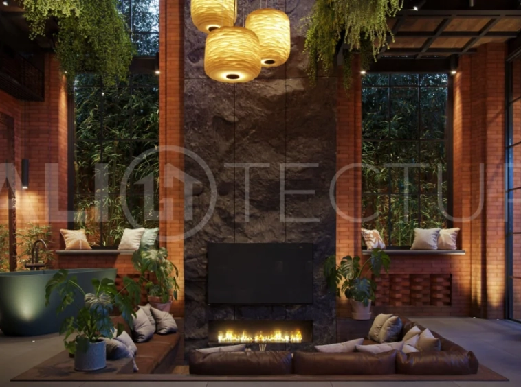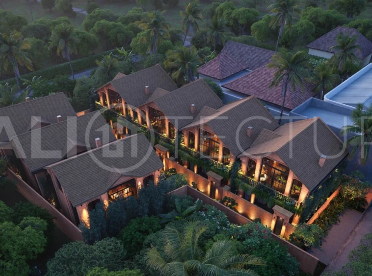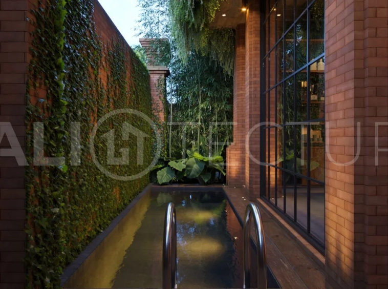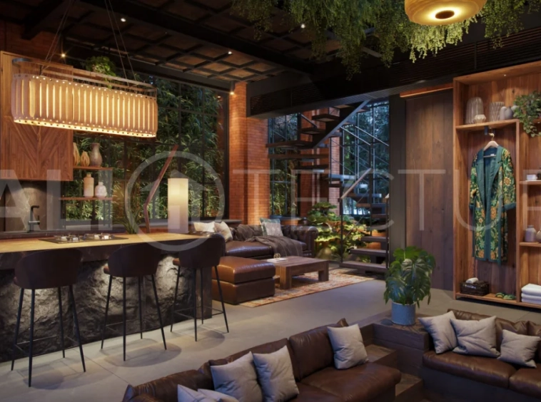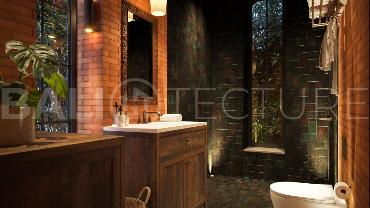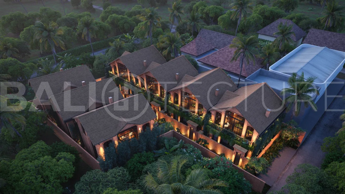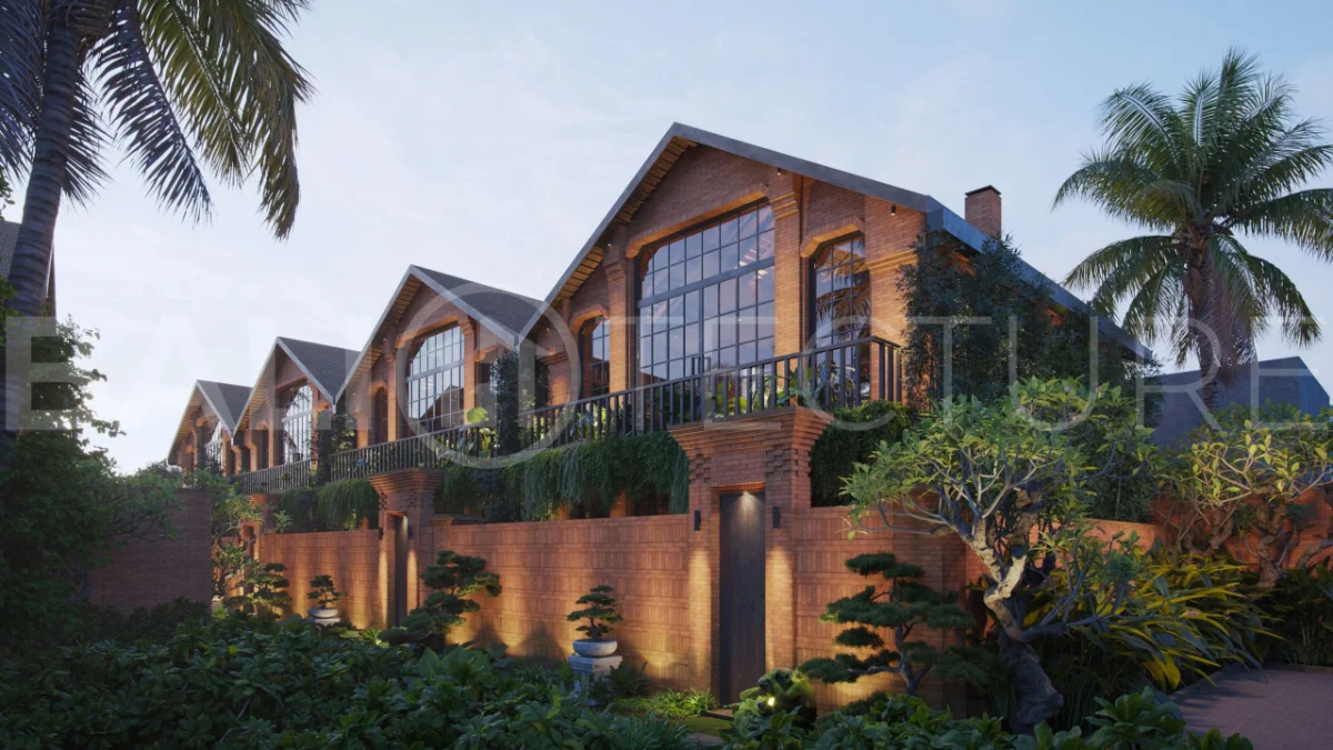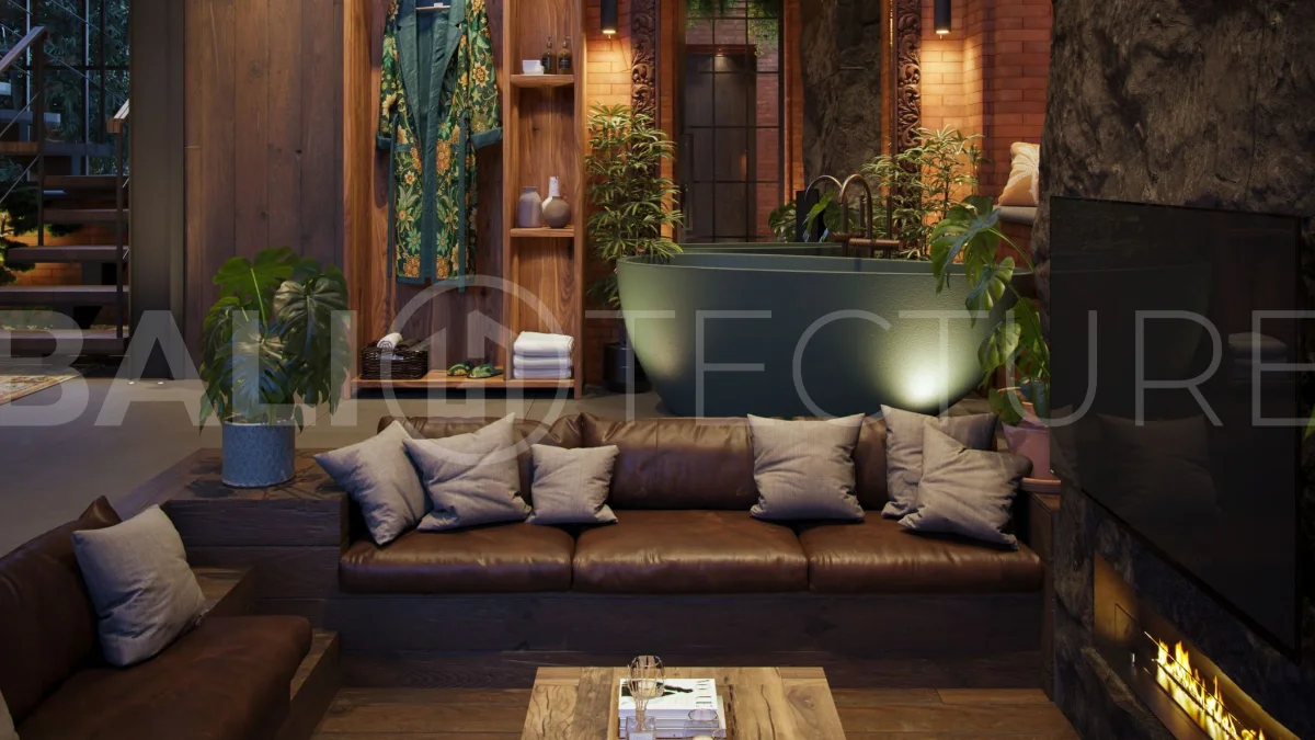 The architectural concept presents a refined fusion of industrial loft aesthetics with the timeless elegance of traditional Balinese design. Elements such as handcrafted brickwork, sculptural details, and lush tropical landscaping create a unique and atmospheric living environment that reflects both character and cultural depth.
